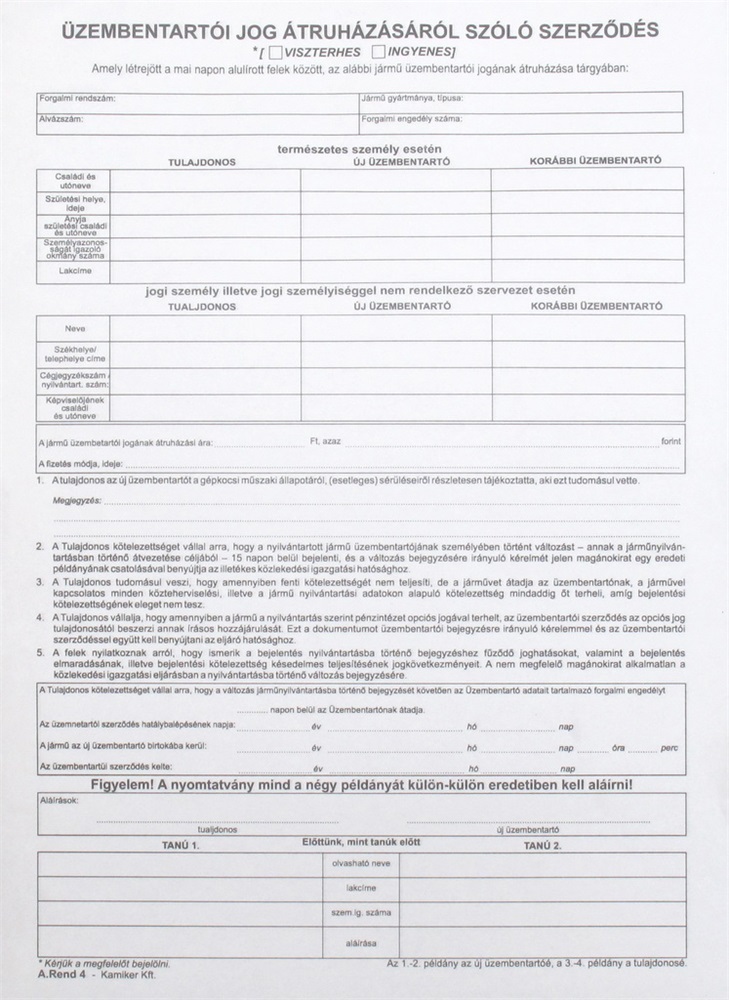 Nyomtatvány üzembentartói szerződés A/4 4pld